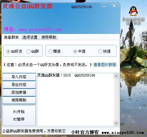 灵魂QQ群发器公益版,无广告,不收费。可QQ群群发,QQ好友群发,QQ群营销的好帮手。省去了很多手力。帮助大家节约手上花的时间!注意:此软件可能被杀软误报,为正常现象。添加信任即可、并不存在寎毒牧马,请大家放心使用!  ...阅读全...