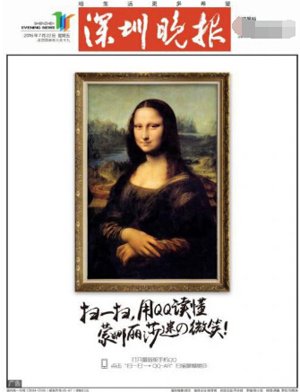 今天,腾讯QQ在《深圳晚报》上刊登了一则神秘的广告,报纸封面是一整幅蒙娜丽莎的画像,下面附上了“扫一扫,用QQ读懂蒙娜丽莎迷的微笑”的广告文案。据悉,这则广告是腾讯QQ为新推出的“AR传火炬功能”做的宣传。用户只需打开手机QQ,扫一扫并选择“QQ-AR",对准“梦娜丽莎”图像扫描即可。扫描之后,你的手机上就会出现一个企鹅火炬手。据悉,这是腾讯QQ针对今年的巴西里约奥运会...阅读全文>>...