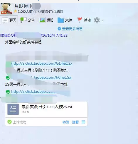 这两天“圈内”都流传着QQ群文件破群规无限制上传的漏洞。可以实现无限制的在任何群内上传任何文件,包括设置了禁止普通群成员上传文件的QQ群。且可以实现上传文件后“隐身”,不被群主或管理员发现。标题或许有些夸张,但博主觉得还比较实用,故分享给大家,希望对大家有所帮助。具体操作步骤如下:1、找到可以上传文件的QQ群,上传需要上传的文件。2、在已上传QQ群点击“转发”,转发可以同时转发...阅读全文>... 阅 读 全 部 >