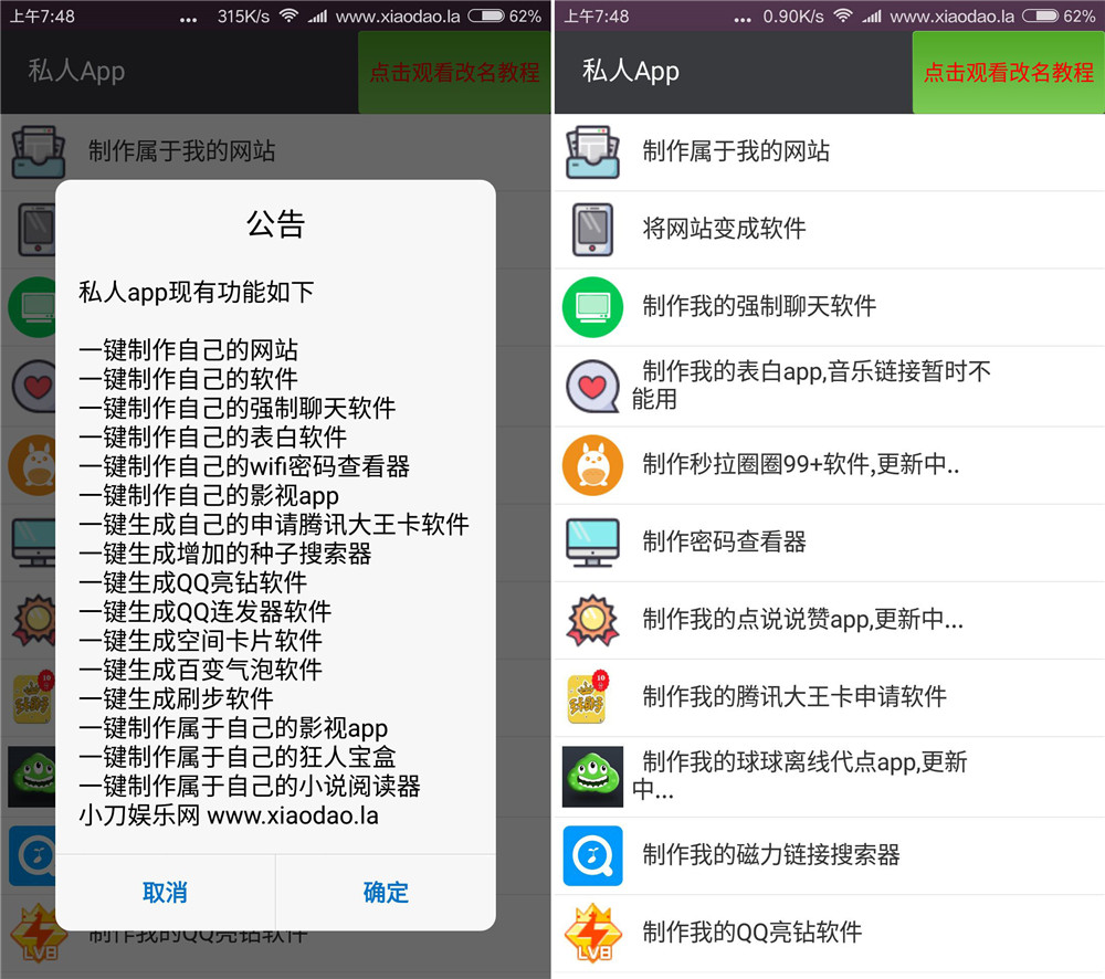 2月24日更新至5.8更新一键制作短视频下载器更新一键制作短网址生成器修复已知BUG---------------------------全部功能如下:一键制作短网址生成器一键制作短视频下载器一键制作免root跳一跳刷分软件一键制作特殊字体恶搞名片软件一键制作空间视频提取软件一键制作刷QQ运动步数软件一键制作自动点名片赞软件一键制作仿微信充值软件一键制作二维码生成软件一键制作全网音乐下载软件一键制... 阅 读 全 部 >