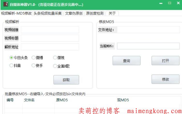 视频批量修改MD5,解析各大自媒体平台视频批量采集今日头条视频,可以配合修改MD5伪原创文章相似词修改自媒体神器v1.0一键伪原创大小: | 来源:兰奏网盘已经过安全软件检测无毒,请您放心下载。阅读全文>>... 阅 读 全 部 >