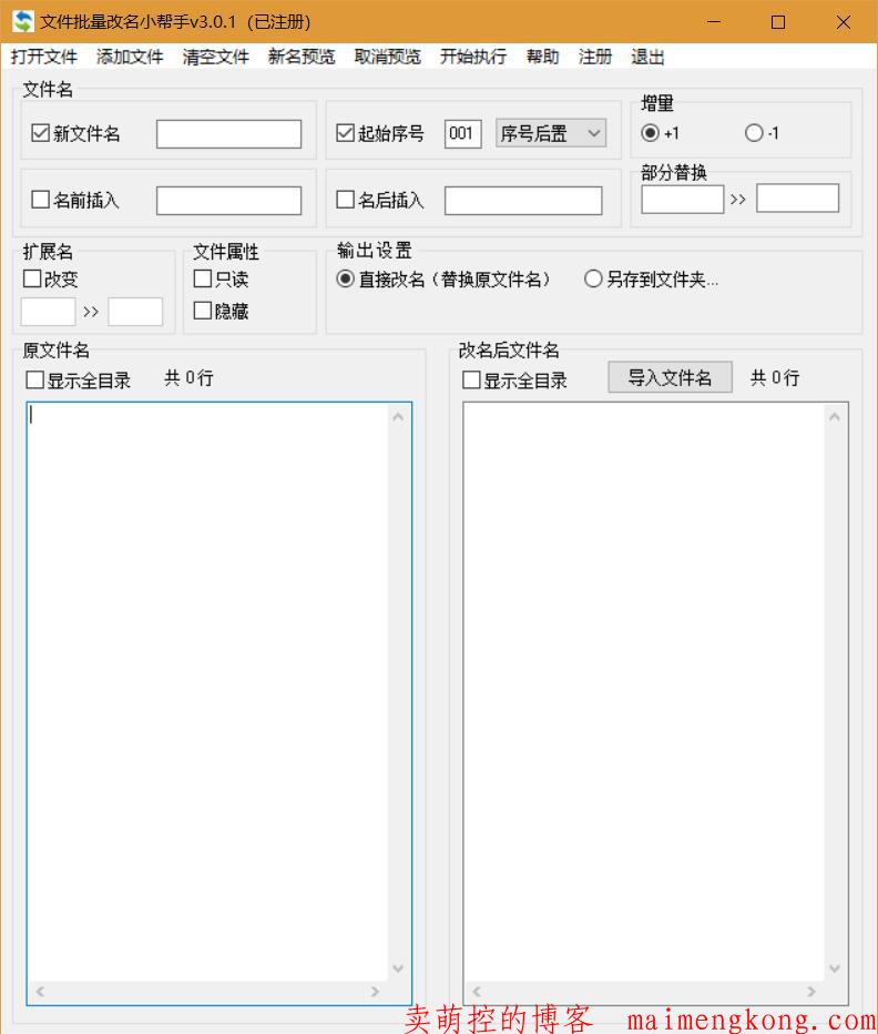 快捷、方便、直观的实现文件批量改名。 支持所有文件格式;支持自动排列序号;支持改变扩展名(后缀名);支持修改文件属性(只读、隐藏文件);支持文件名部分替换;支持在原文件名前插入字符;支持在原文件名后插入字符;支持改名后另存到指定文件夹,保留原文件;支持预览; 文件批量改名v3....阅读全文>>... 阅 读 全 部 >