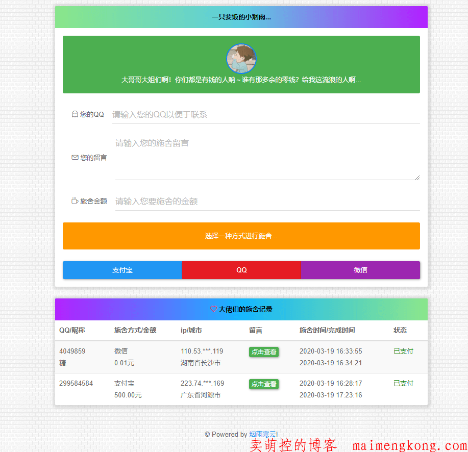 时隔一年多,烟雨云要饭系统再次来袭,此次更新底层全部重构,拖拖拉拉终于写完! 本次亮点: 1.全自动引导安装,无法安装的几率小之又小,小白也能轻松装 2.整体架构性能提升 3.全Ajax操作,更人性化 4.强制使用php7,性能更上一层楼 5.没得哔哔了。。。 更新日志: 2020/3/20 1.修复后台无法... 阅 读 全 部 >