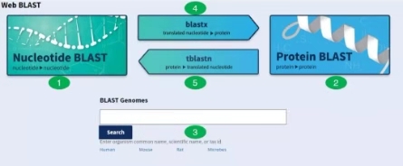 毋庸置疑,NCBI,UCSC,Ensembl,UniProt四个数据库功能非常强大,下面给大家介绍下我自己用的最多的功能。NCBI 中BLAST工具NCBI中的Nucleotide BLAST、Protein BLAST、BLAST Genomes(对应图中的1、2、3),这三种比对工具用的最多,其余两种blastx、tblastn(对应图中的4和5),用的相对较少,但是不得不说,...阅读全文&...