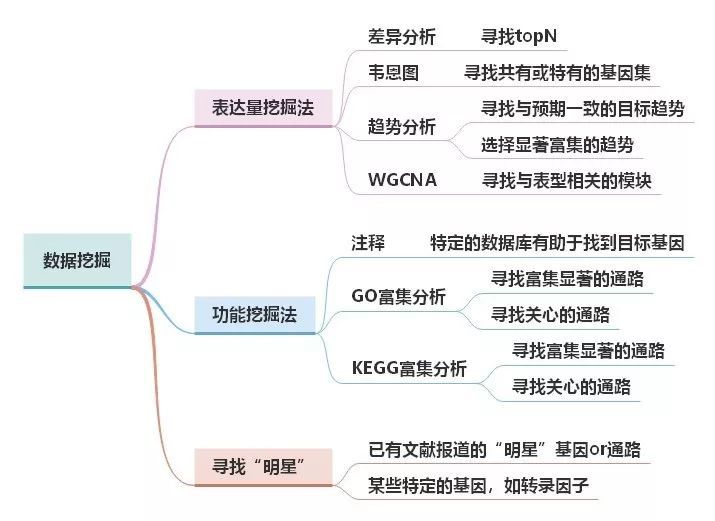 我们上一期介绍了数据挖掘中的表达量挖掘法(回顾戳这里☞),相信大家都已经了解了四大利器的威力,那么今天我们就带大家接着了解一下功能挖掘法和寻找“明星”的数据挖掘方法吧。图1.转录组数据挖掘常用方法功能挖掘法虽然我们进行了表达量的挖掘,但是每个基因在生物过程中都具有它们独特的功能,仅关注表达量的信息,会让我们漏掉非常多的信息。因此我们不能局限于表达量挖掘,而忽略了基因的功能。数据的挖掘除了...阅读...