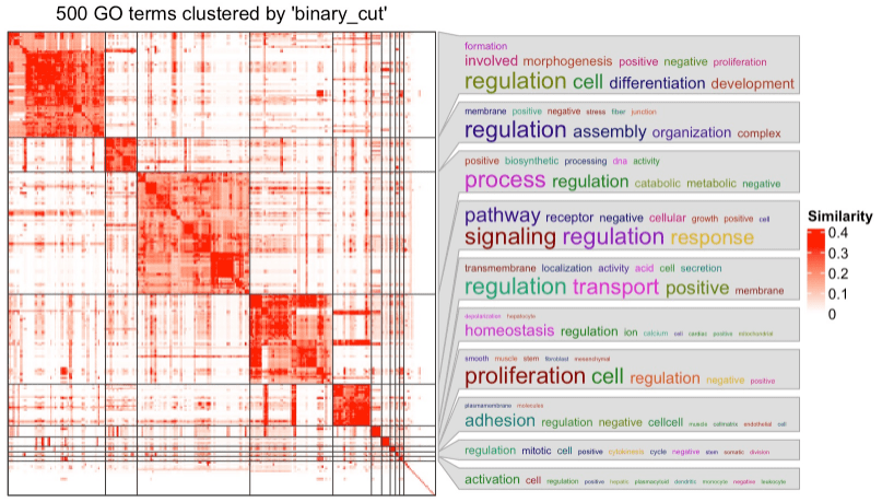 作者:作图丫背景介绍通常我们进行功能富集分析,对基因集进行功能注释的时候,往往会得到大量显著富集的功能,今天小编给大家介绍的simplifyEnrichment包,就可以通过binary cut的方法,将GOSemSim得到的GO相似度矩阵进行划分,从而将GO划分为几个类,通过注释就可以知道每个类对应的功能是什么。R包安装###通过github安装simplifyEnrichment...阅读全文...