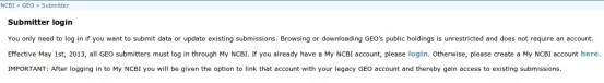 还在为不知如何上传GEO数据库而发愁吗?还在为不愿意看繁琐的英文帮助而不知所措吗?一篇帖子教你如何上传GEO数据库,建议收藏,再也不用愁“书到用时方恨少”了。1、创建账号如果要上传GEO数据库,首先要创建NCBI帐号, 网址:https://www.ncbi.nlm.nih.gov/geo/submitter/登录成功后,回到GEO的主页,点击 Submissi...阅读全文>>...