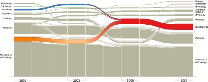 冲击图(alluvial diagram)是流程图(flow diagram)的一种,最初开发用于代表网络结构的时间变化。实例1. neuroscience coalesced from other related disciplines to form its own field. From PLoS ONE 5(1): e8694 (2010)实例2. Science...阅读全文>&g...