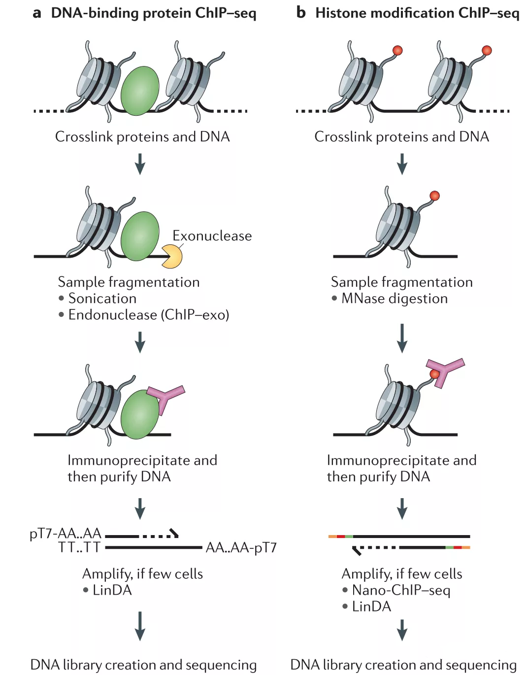 1. CHIP-seqChIP-Seq技术是研究蛋白质与DNA相互作用的有力工具,利用该技术可以检测转录因子与DNA的动态调控作用,各种组蛋白修饰,染色质调控因子等,转录因子与组蛋白修饰的ChIP-Seq示意图如下:ChIP-Seq技术包括两部分:建库和测序,建库和测序的质量对于后续分析尤为关键,但是建库前ChIP实验的设计也同样重要。从实验的操作来讲ChIP主要分为两大类,一类是X...阅读全文... 阅 读 全 部 >