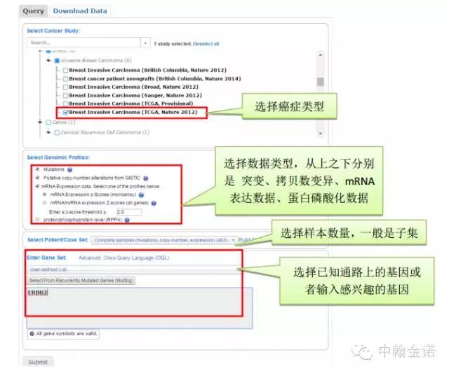 数据集为“2012年TCGA发表的乳腺癌的研究”;分析类型,确定数据分析类型,以突变数据、拷贝数数据和表达数据为例;检索的基因,以“ERBB2”为例。点击Submit后会得到如下结果。OncoPrint页面显示的是检索的基因在所有样本中的突变、拷贝数、表达情况,如ERBB2在463个乳腺癌样本中发生变化的样本数目是89个,其中图中一个小竖条代表一个样本。把鼠标放到某个样本上可以显示更多信息,点击其...