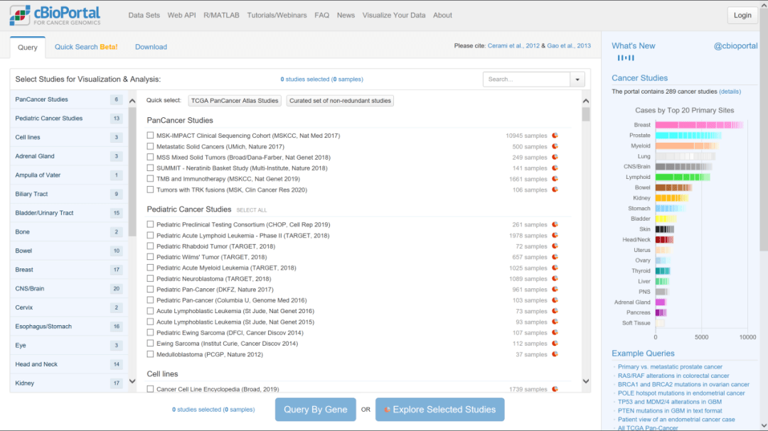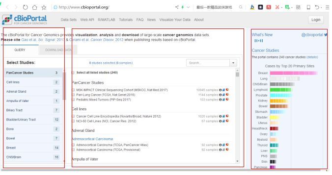 今天,小编将为大家介绍一个无需代码,并且免费使用的TCGA子数据库——cBioportal网站。毋庸置疑,这是一个科研汪们集万千宠爱的网站。首先,我们进入网站了解一下。官网网址为http://www.cbioportal.org/。进入官网后,主页分为以下三个区域,左侧的为选择研究的区域(按器官对各肿瘤分类),中间是下载研究数据的区域,右侧区域是对各研究数据的一个总结及该癌种的临床信息。...阅读...