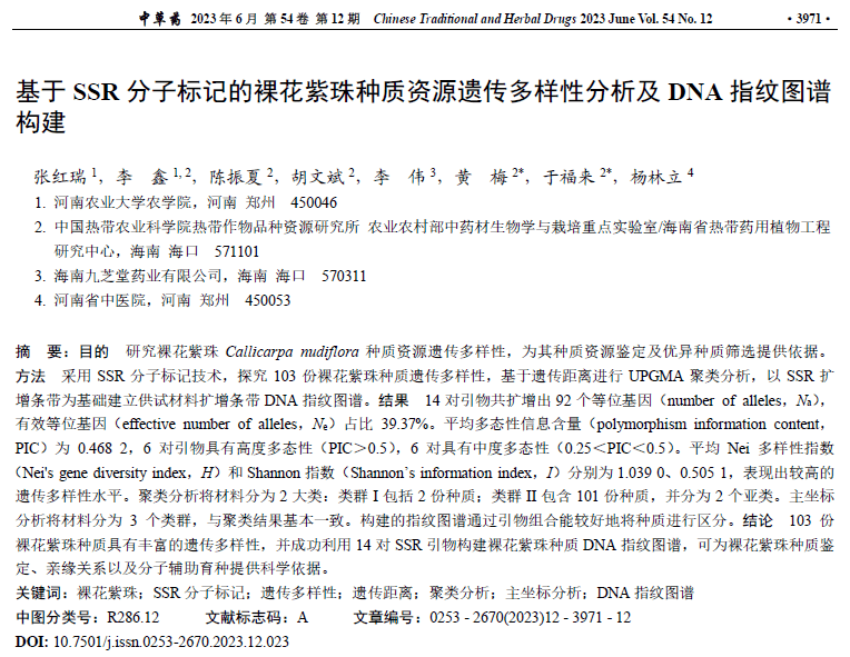 基于SSR分子标记的裸花紫珠种质资源遗传多样性分析及DNA指纹图谱构建