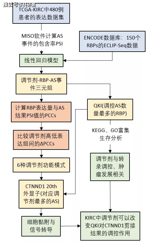 今天和大家分享的是2020年3月发表在Frontiers in Genetics(IF:3.517)上的一篇文章,“Modulator-Dependent RBPs Changes Alternative Splicing Outcomes in Kidney Cancer”,文章中作者使用TCGA数据库中的肾透明细胞癌数据集,以MISO软件计算可变剪接事件的包含率,进一步通过构建调...阅读全文... 阅 读 全 部 >