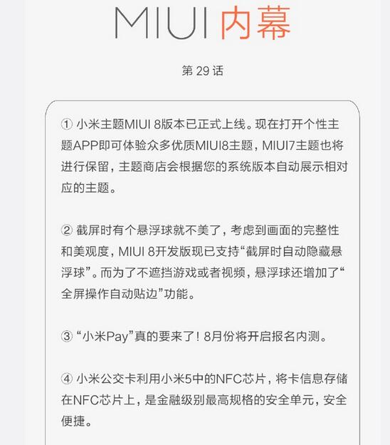 看来MIUI 8即将新增一个重磅功能了!今日,MIUI官方微博宣布:“小米Pay”真的要来了,8月份将开启报名内测。而早在昨天晚上的MIUI直播当中,小米员工就爆料了即将推出“小米Pay”,并表示首批内测送十个名额。据悉,8月份开启内测活动,预计下半年就将正式推出。值得一提的是,前不久MIUI团队表示MIUI 8将加入小米指纹支付功能,届时除了支付宝、微信,小米Pay也将...阅读全文>&g...