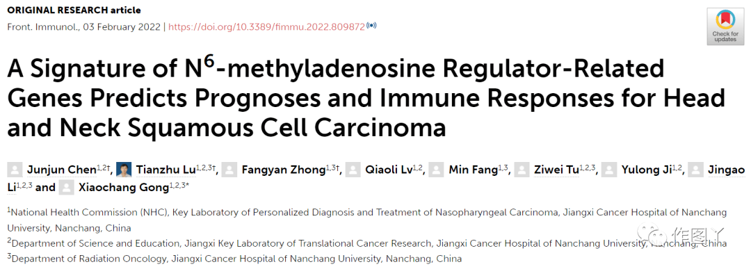 导语GUIDE ╲基于m6A调节因子的signature可以区分头颈部鳞状细胞癌患者的预后。背景介绍今天小编为大家带来一篇经典的m6A调节因子相关基因作为signature进行分型预后的文章。这篇文章2022年2月刚刚发表在 Front Immunol (实时影响因子8分+),说明今年m6A依然是热点。 数据介绍本文使用TCGA-HNSCC数据(https://xenabrowser.n...阅读...
