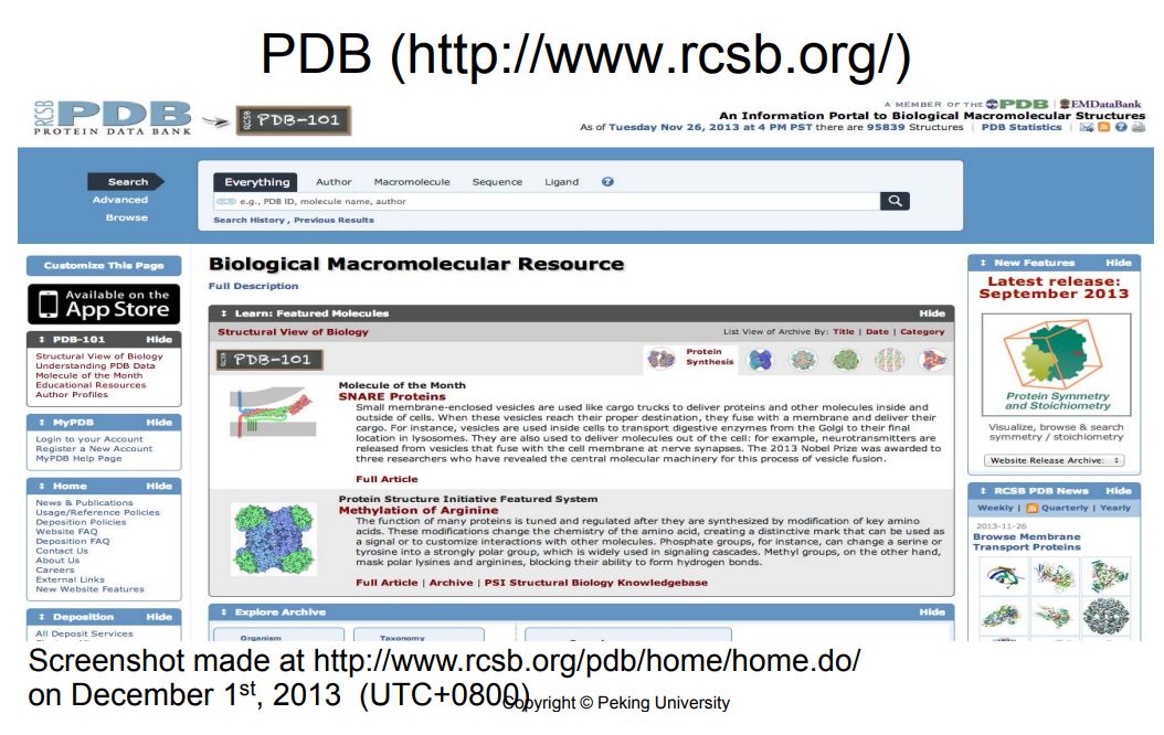 这一节里,我们来看一下独立资源的几个例子。一个很重要的资源是蛋白三维结构数据库 Protein DataBank (PDB)。我们这门课里对于蛋白三维结构的计算和预测讲的很少,但这其实也是非常重要的资源和研究方向。Protein DataBank现在主要是由Rutgers和UC Sandiego共同来管理。它目前共有9万多,将近10万的三维结构,包括8万多的X-r...阅读全文>>...