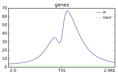 eak在TSS上下游的分布图是ChIP测序中非常关键的一张图。有这张图,我们就能知道目的蛋白(组蛋白或转录因子)在转录起始位点(TSS)及上下游附近的整体分布/结合情况。 图中横坐标为基因位置,纵坐标为reads的覆盖深度,它可以反映目的蛋白分布情况。input由于没有富集,其reads通常分布较低,而IP对目的蛋白及其结合序列的富集作用则会使reads覆盖深度提高,产生相应的...阅读...