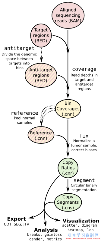 cnvkit被设计来处理同一个批次的多个肿瘤配对样本测序情况,首先对所有的normal数据进行bin处理拿到背景值,然后就这个背景值来处理所有的tumor测序数据计算拷贝数变异情况。该软件使用比较复杂,建议读一读官网教程。所有的命令都被包装到一个python脚本里面,使用该脚本调用一系列字命令,如下:官网教程Copy number calling pipelinebatchtarge...阅读全文...